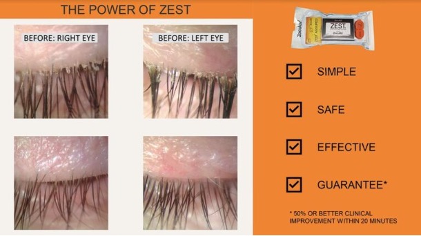 Zest is a deep cleansing of the lids to revitalise your eyes for lasting comfort. Aimed to refresh the ocular surface and clear the eyelids/lashes. The procedure is to use a cotton swab to rub in the zest gel onto the eye lids (eyes closed), this will be done with a fast (and soft) motion to make the gel begin to foam.